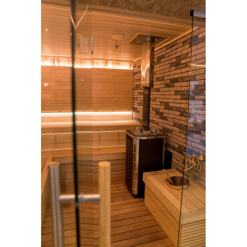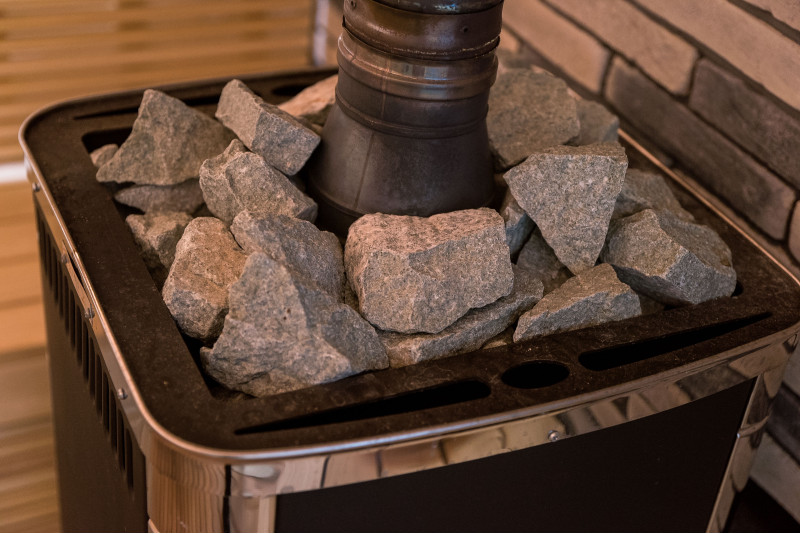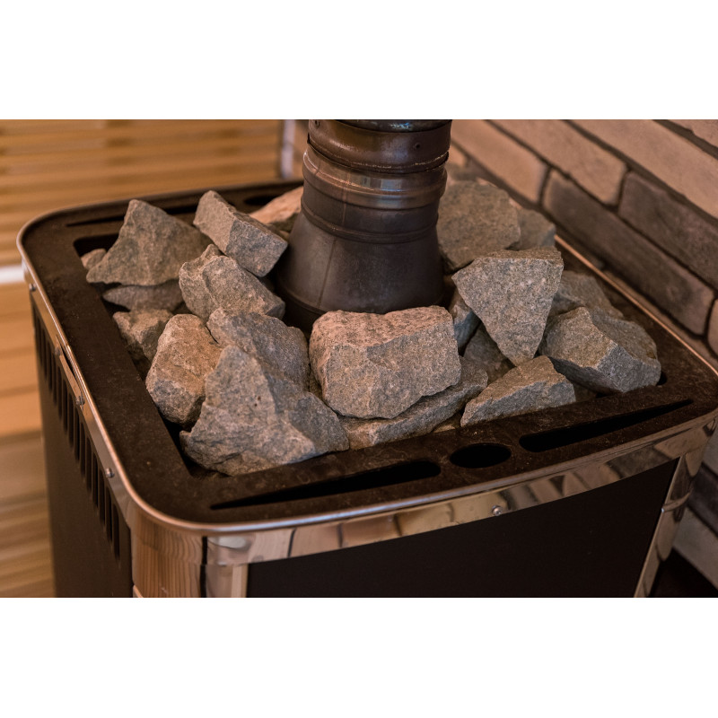 Saunaofen aus Holz - TMF KALINA VITRA. Der Ofen ist mit gemischten Steinen gefüllt - finnischer Olivin und gebrochener Jadeit.