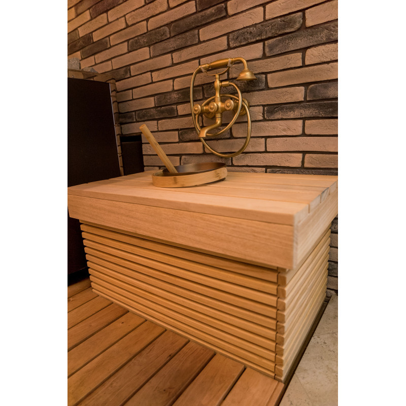 Innenausstattung der Sauna - Lindenholz, Bettbretter, Bodenroste - Abachi-Holz. Betten, Stützen und Wände sind mit Öl imprägniert und lackiert.