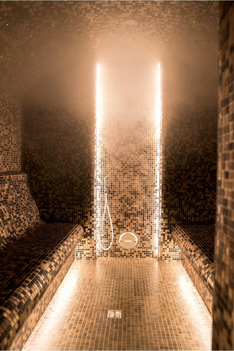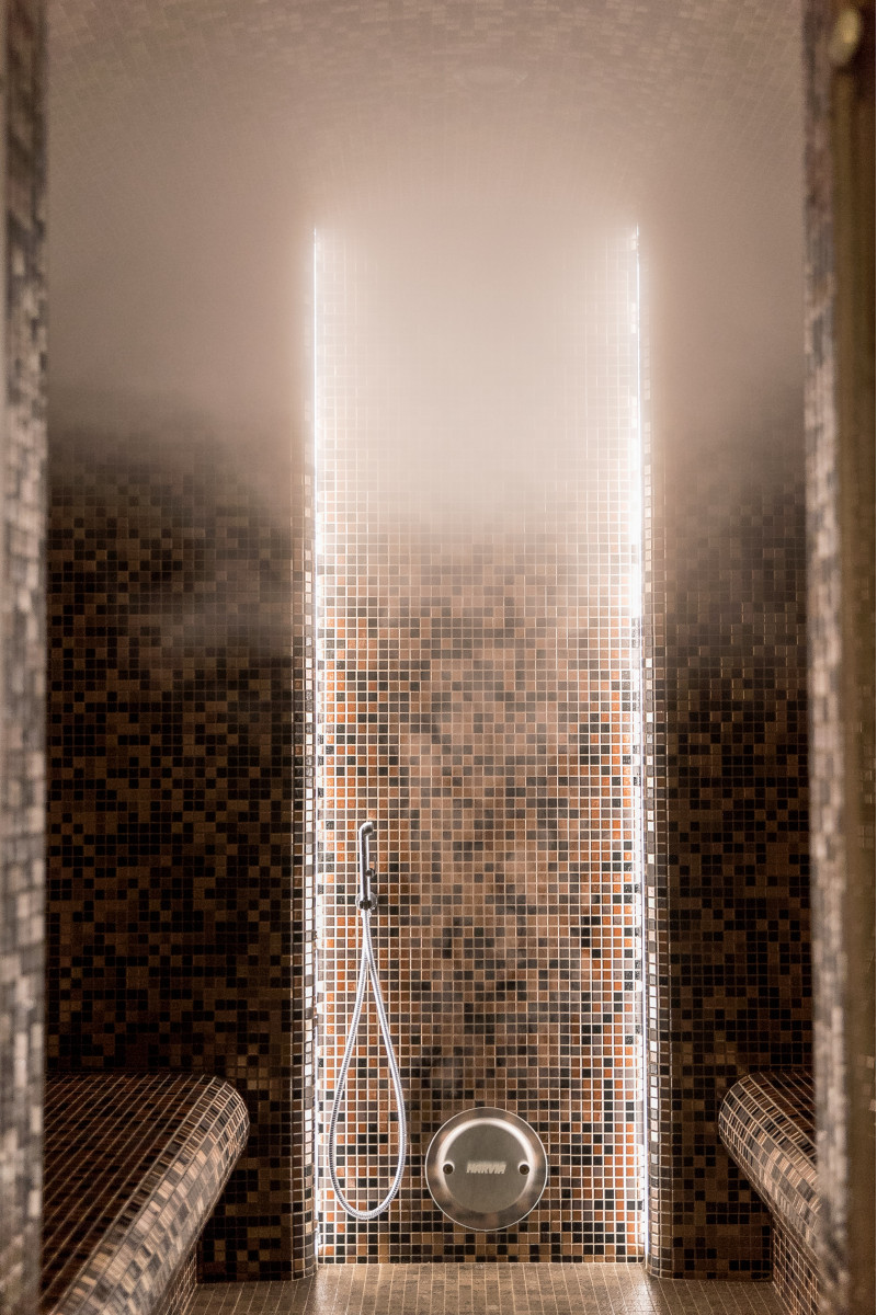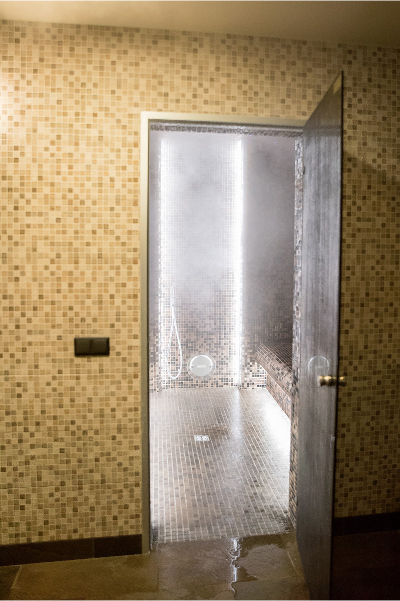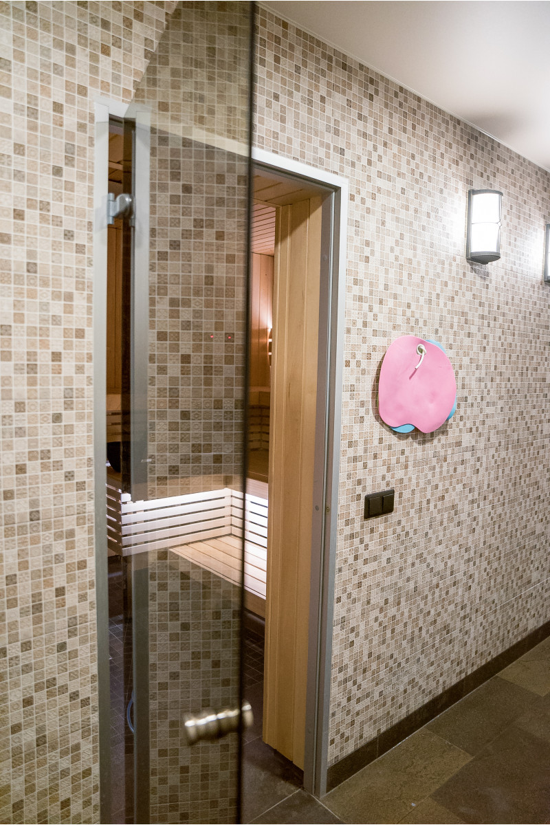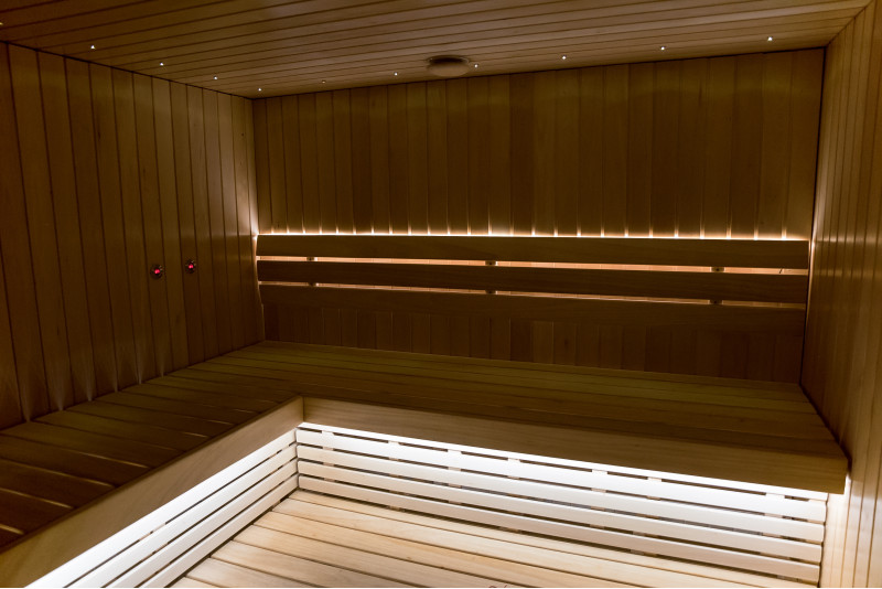 Zur Beleuchtung der Sauna kam das faseroptische Beleuchtungssystem "Sternenhimmel" zum Einsatz - LED-Lichtstrom mit wechselbaren Farben.
