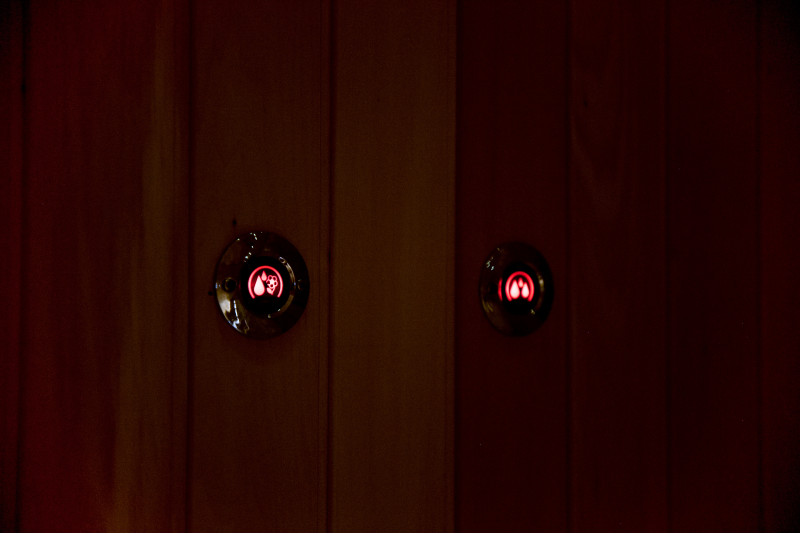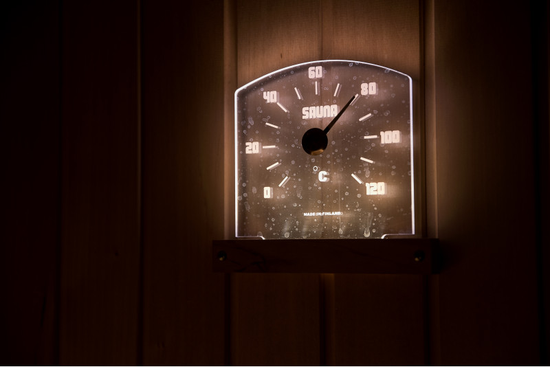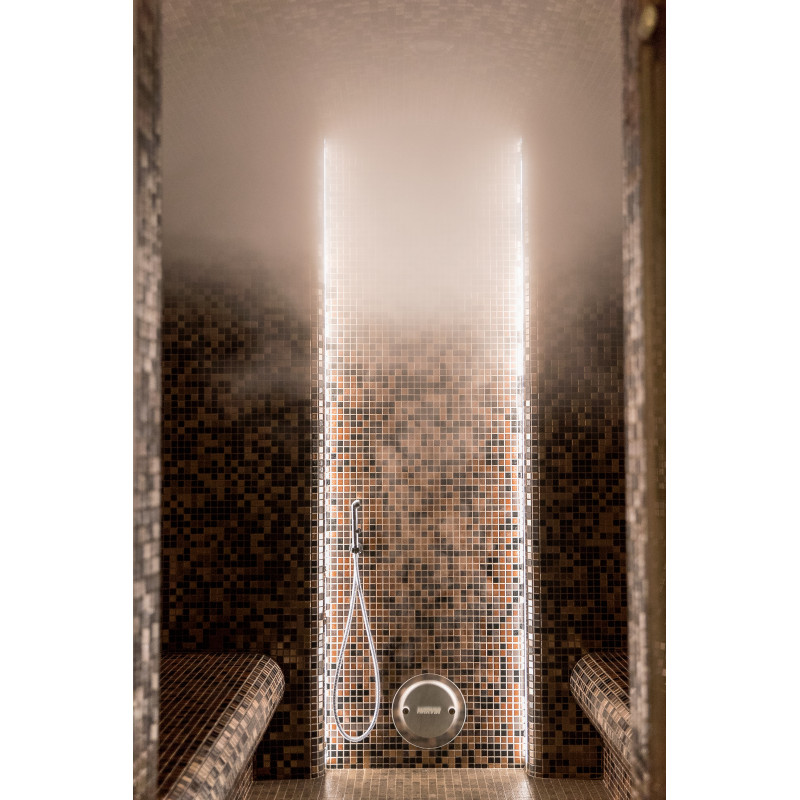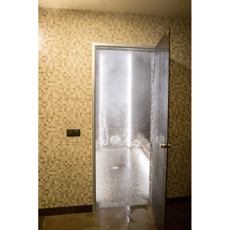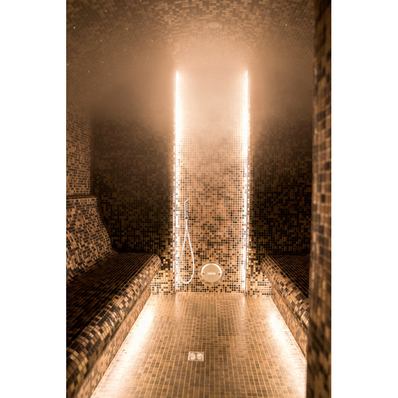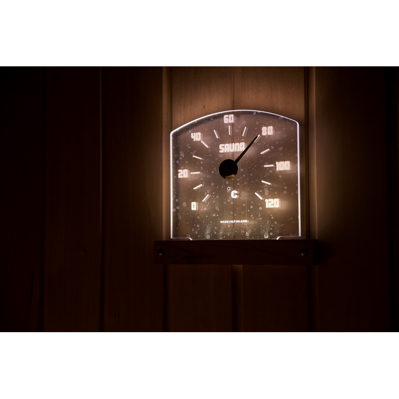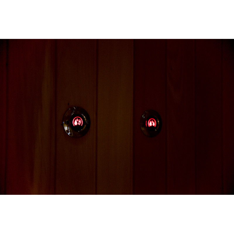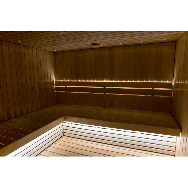 Ausgestattet mit farbiger RGB-Beleuchtung unter den oberen Bänken und Rückenlehnen. Diese Saunabeleuchtung ist feuchtigkeits- und temperaturbeständig. Die Farbe der Beleuchtung kann je nach Stimmung geändert werden.