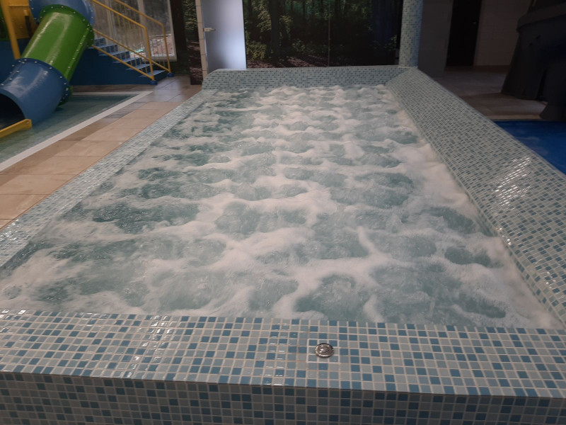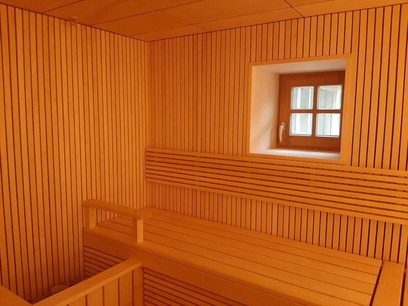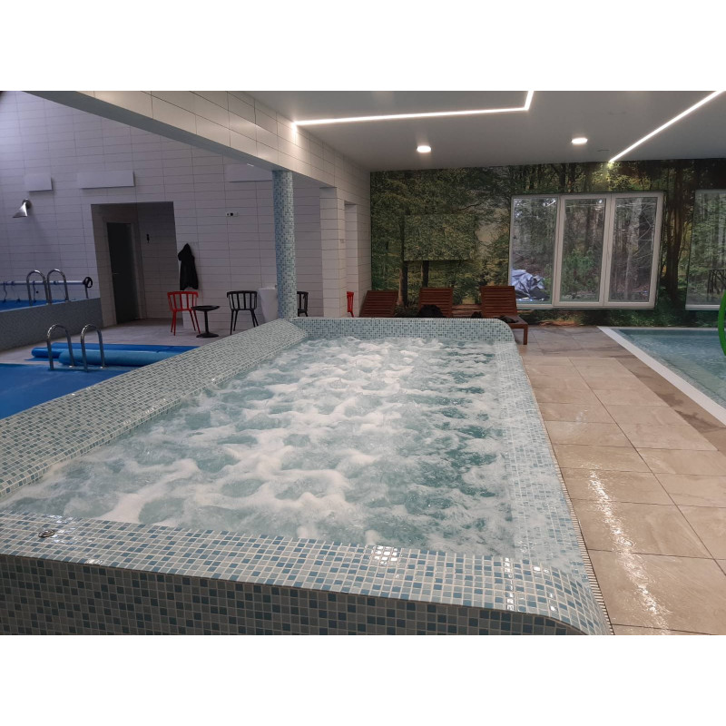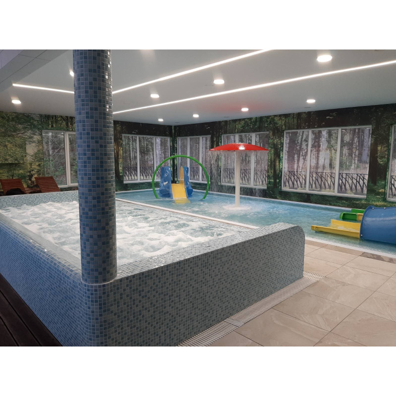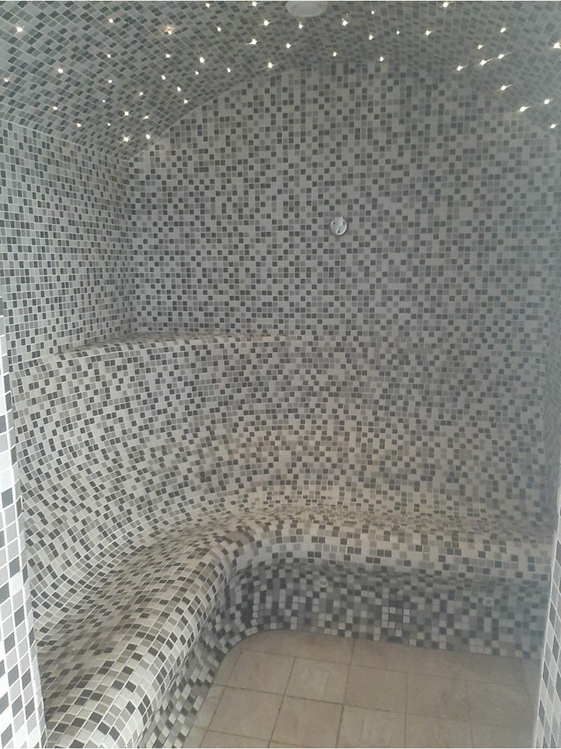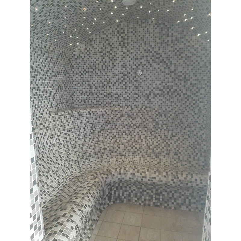 - Dampfsauna - verwendete Materialien, die extrem hohen Temperaturen und sehr hoher Luftfeuchtigkeit standhalten. Die Decke ist bogenförmig, damit das Dampfkondensat nicht auf die Saunagänger tropft. Für die Dekoration wurden Fliesen und für die Decke faseroptische Beleuchtung gewählt, die einen Sternenhimmeleffekt erzeugen. Die Bänke haben eine besonders bequeme Form.
