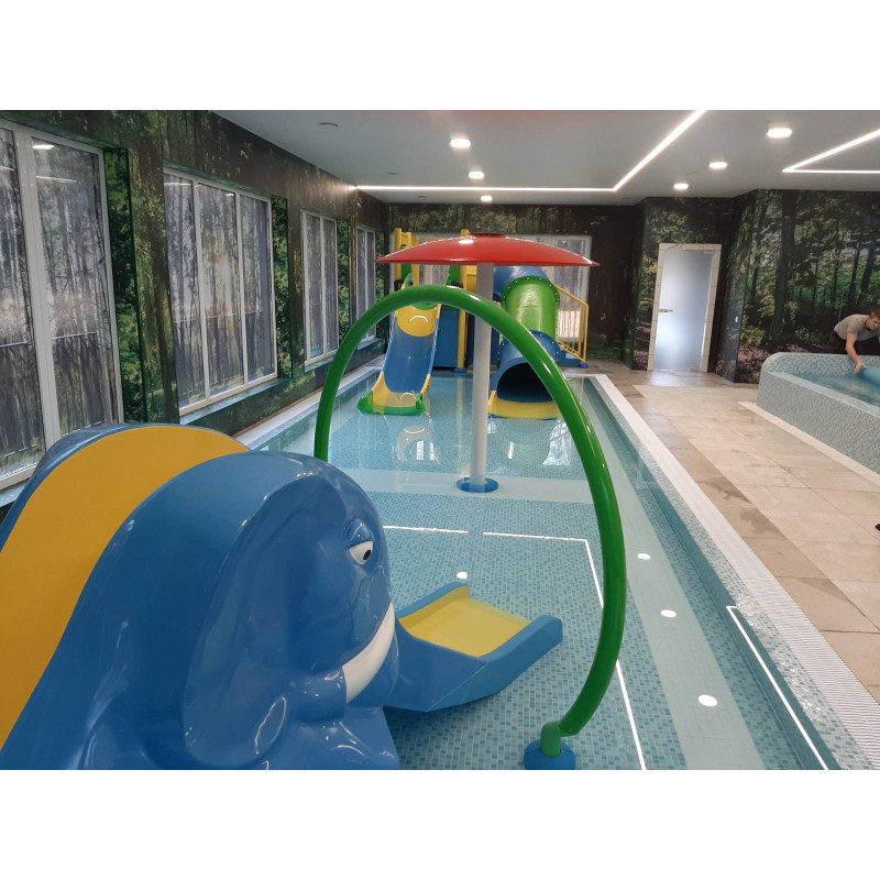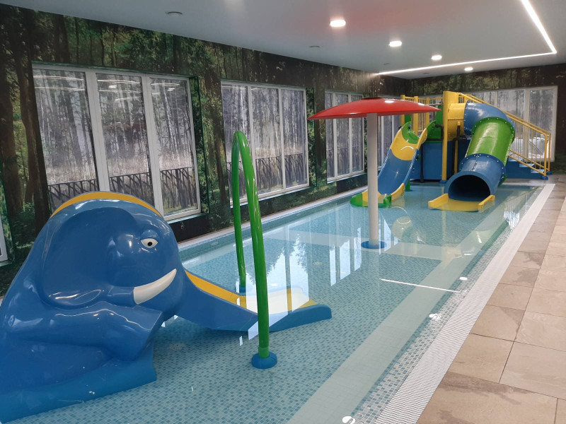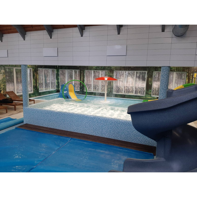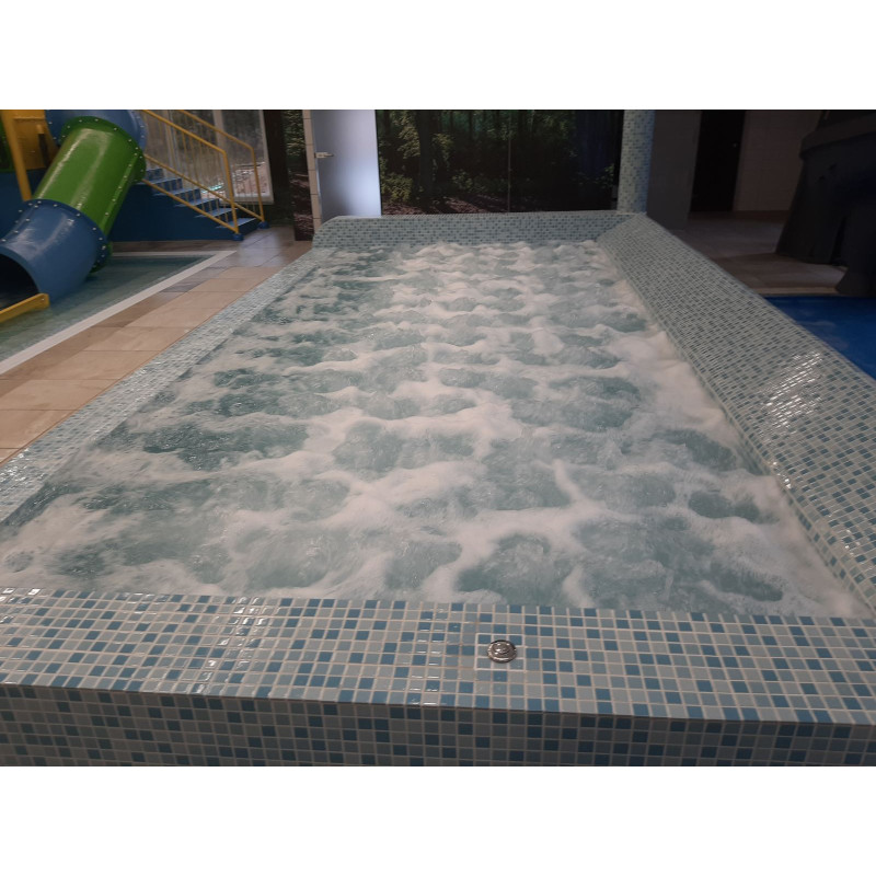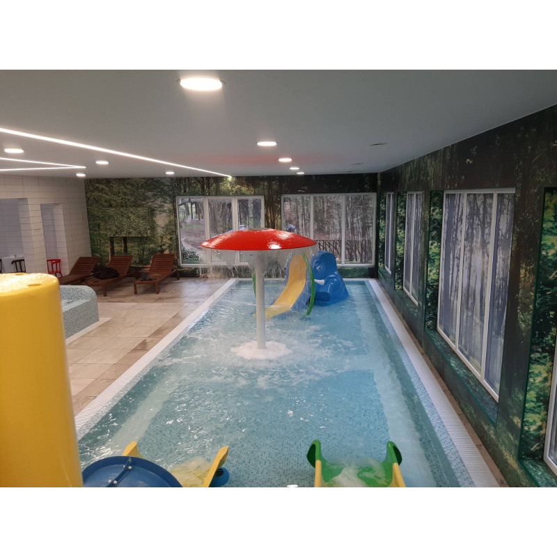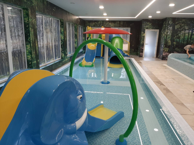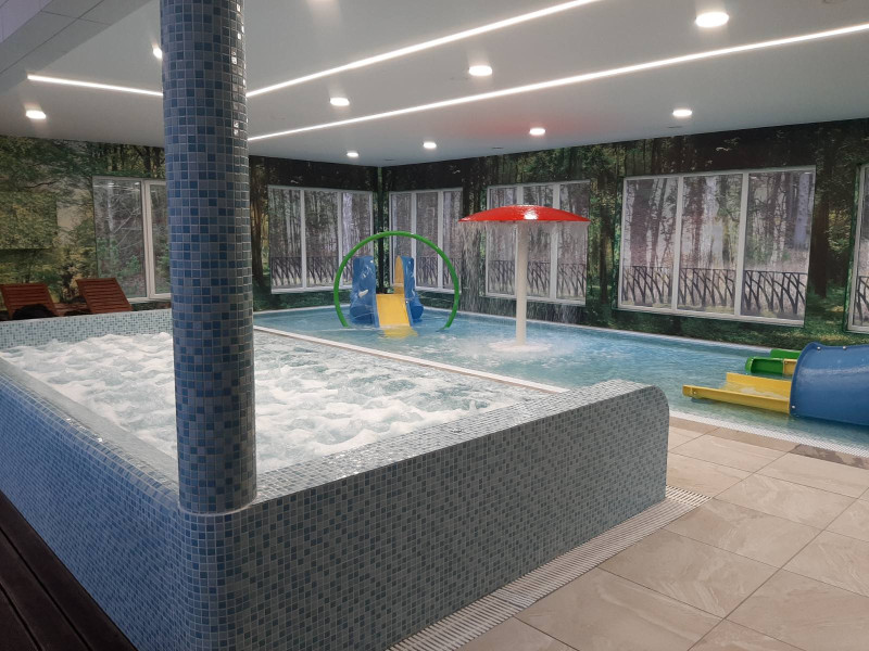 - Dampfsauna - verwendete Materialien, die extrem hohen Temperaturen und sehr hoher Luftfeuchtigkeit standhalten. Die Decke ist bogenförmig, damit das Dampfkondensat nicht auf die Saunagänger tropft. Für die Dekoration wurden Fliesen und für die Decke faseroptische Beleuchtung gewählt, die einen Sternenhimmeleffekt erzeugen. Die Bänke haben eine besonders bequeme Form.