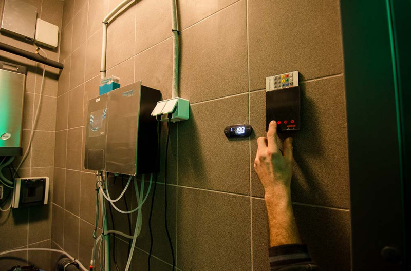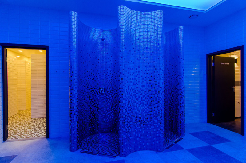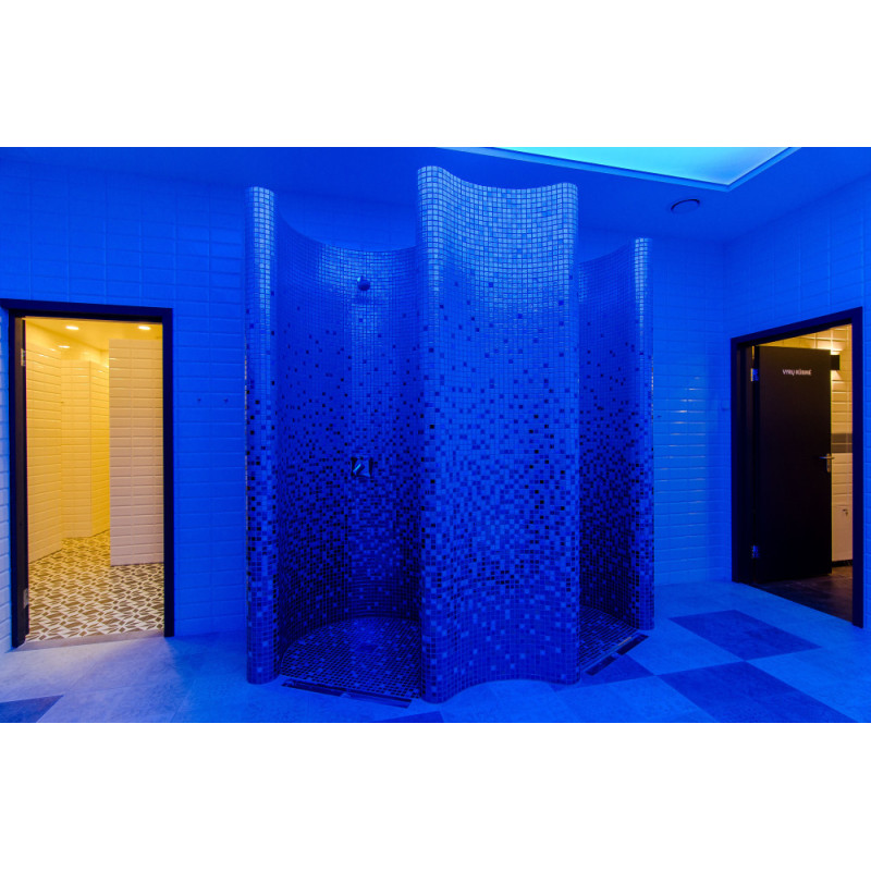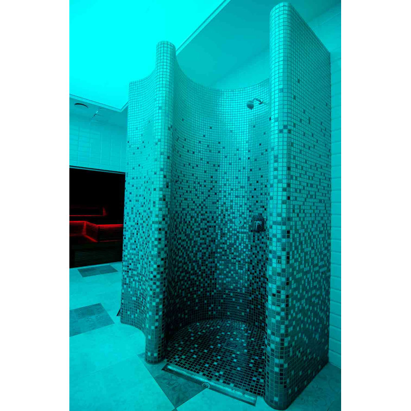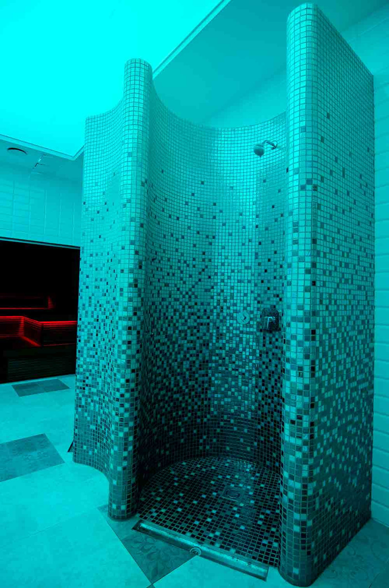 Duschformen werden aus XPS 300 unter Verwendung der spez. Schneidtechnik nach individuellem Design. Formen montiert, imprägniert mit Schonox geschmierter Imprägnierung. Verklebte Mosaikfliesen, der Krümmung angepasst und mit grauer Schonox Abdichtung gefüllt. Duschen - für verschiedene Zwecke. Eine davon - zum einfachen Waschen, die andere - zum Abkühlen nach der Sauna, mit Kaltwasser-Seitendüsen.