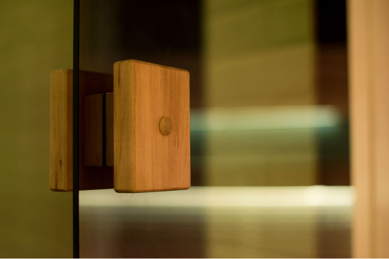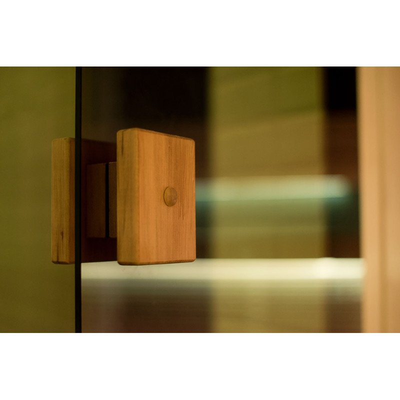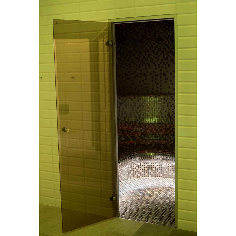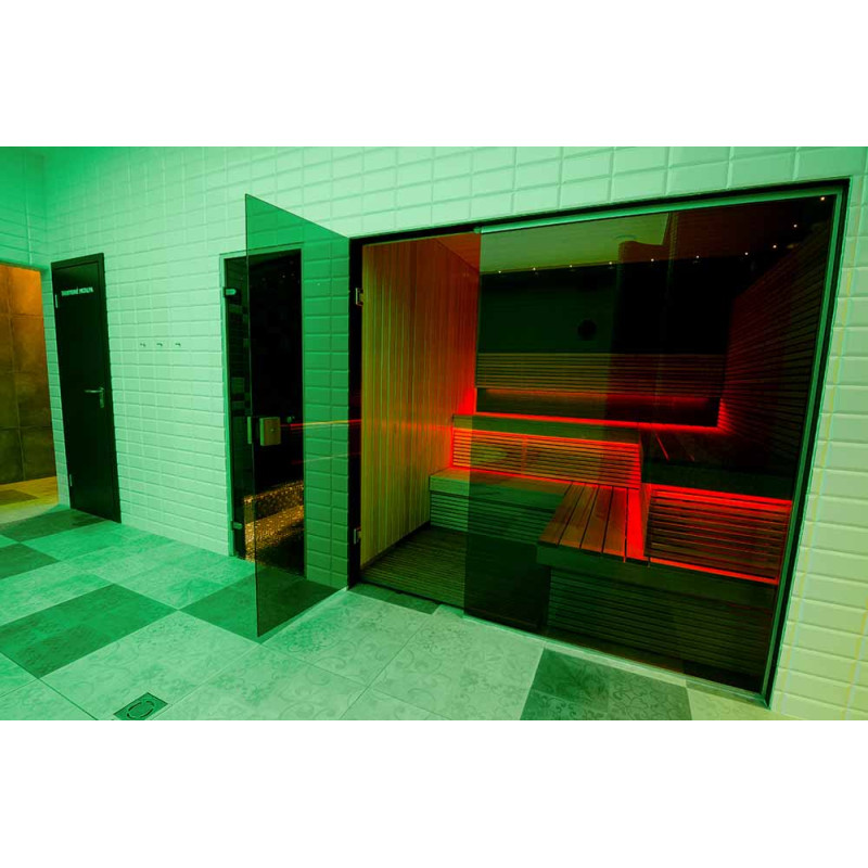 - Die in der Sauna installierte Glasvitrine erweitert den Raum und erzeugt einen fugenlosen Stil, der den Eindruck von Leichtigkeit erweckt, dem Raum Licht und Modernität verleiht. Glasvitrinenglas - getönt, gehärtet, Aluminiumrahmen,