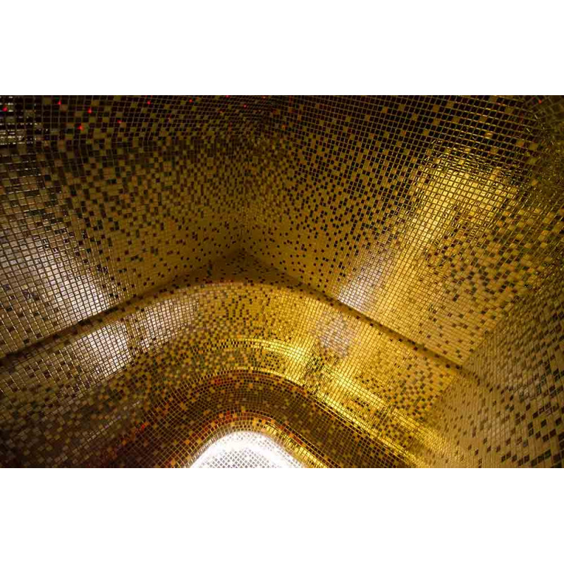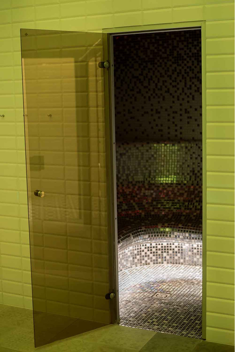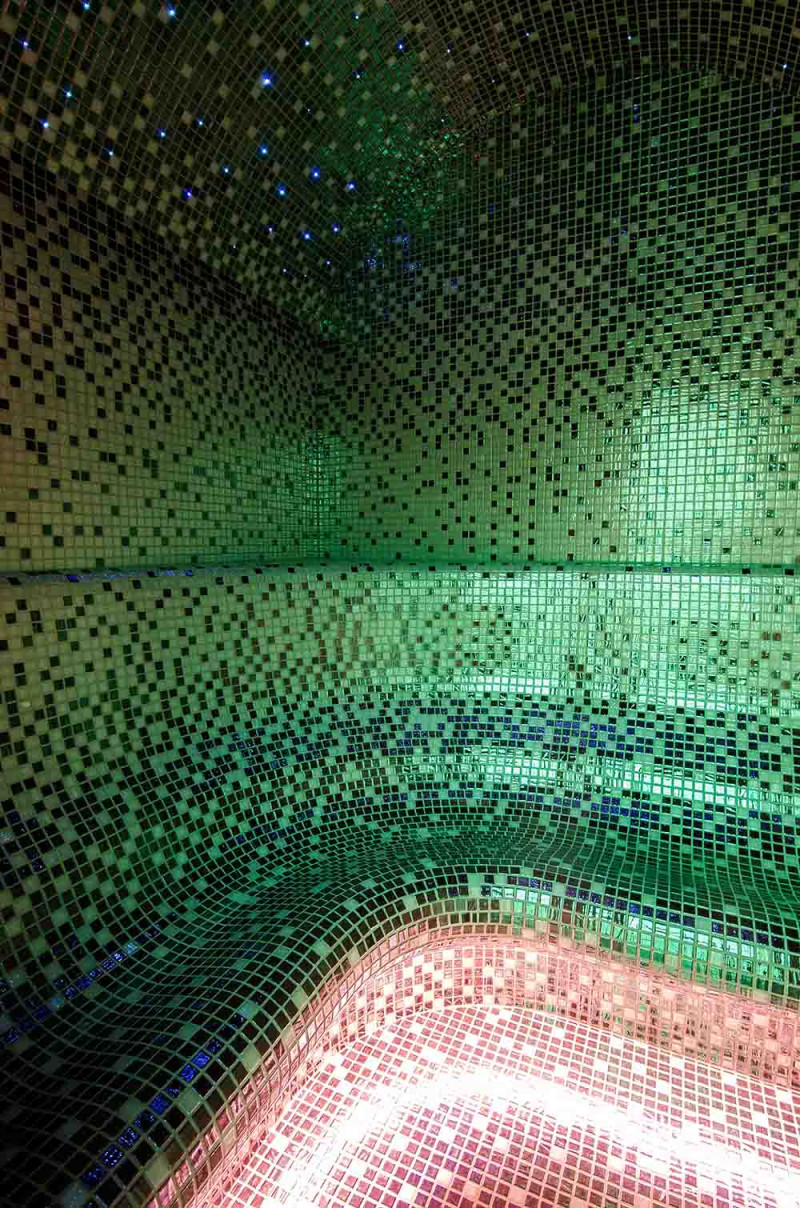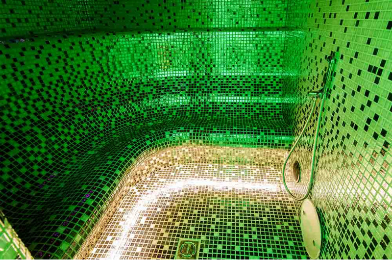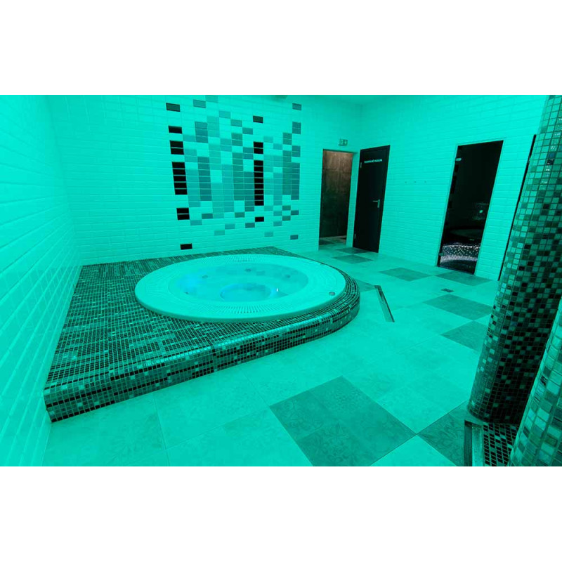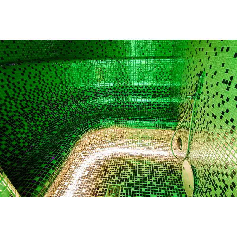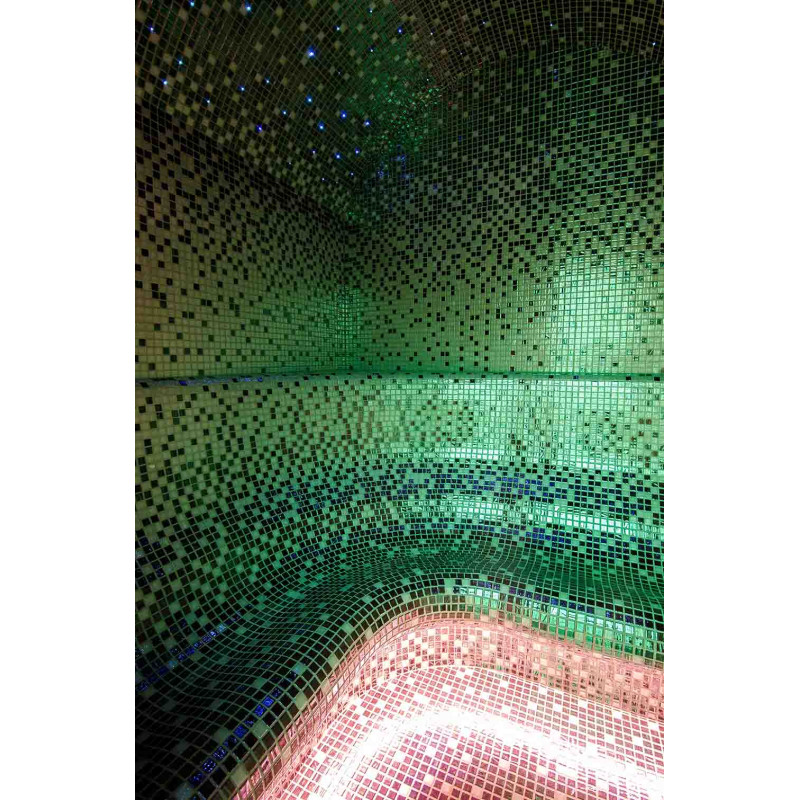 Die Innenflächen des Dampfbades werden nach individuellem Projekt aus expandiertem Polystyrol unter Verwendung von endlos geschnittenem EPS-Styrol geformt. Verklebte Mosaikfliesen, der Krümmung angepasst und mit grauer Schonox Abdichtung gefüllt. Der Boden des Raumes ist beheizt. Türen - Aluminiumrahmen, gehärtetes getöntes Glas. Dampfbadausstattung: