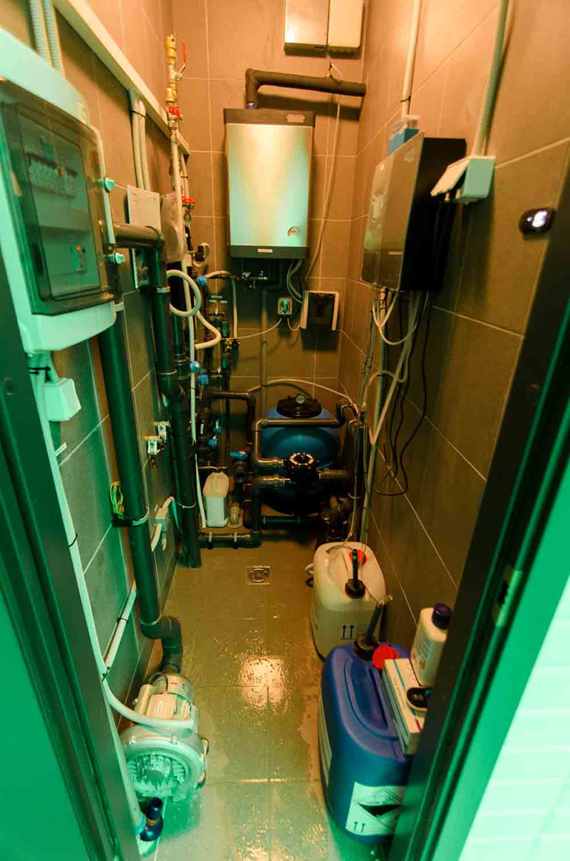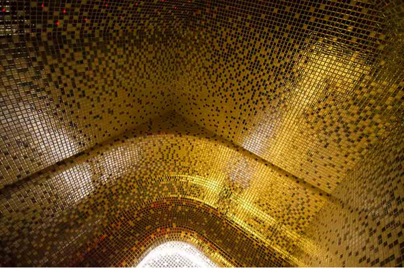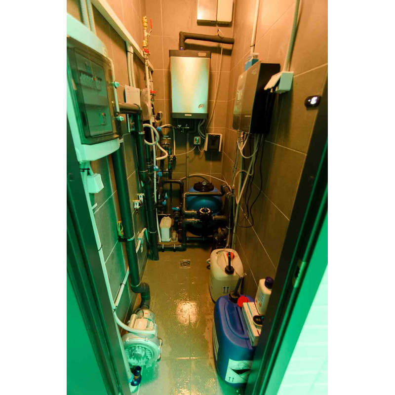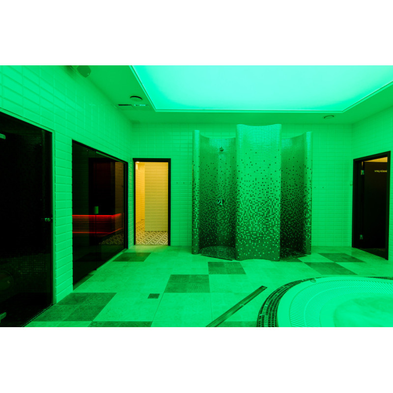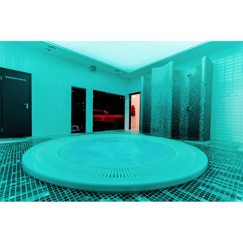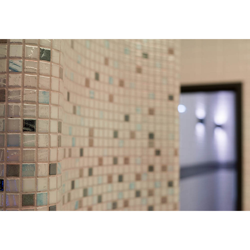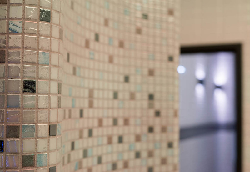 Die Innenflächen des Dampfbades werden nach individuellem Projekt aus expandiertem Polystyrol unter Verwendung von endlos geschnittenem EPS-Styrol geformt. Verklebte Mosaikfliesen, der Krümmung angepasst und mit grauer Schonox Abdichtung gefüllt. Der Boden des Raumes ist beheizt. Türen - Aluminiumrahmen, gehärtetes getöntes Glas. Dampfbadausstattung: