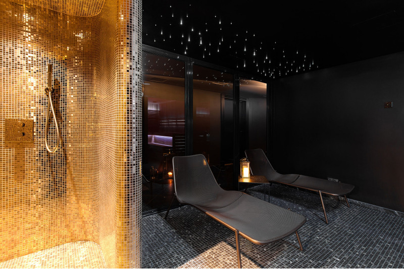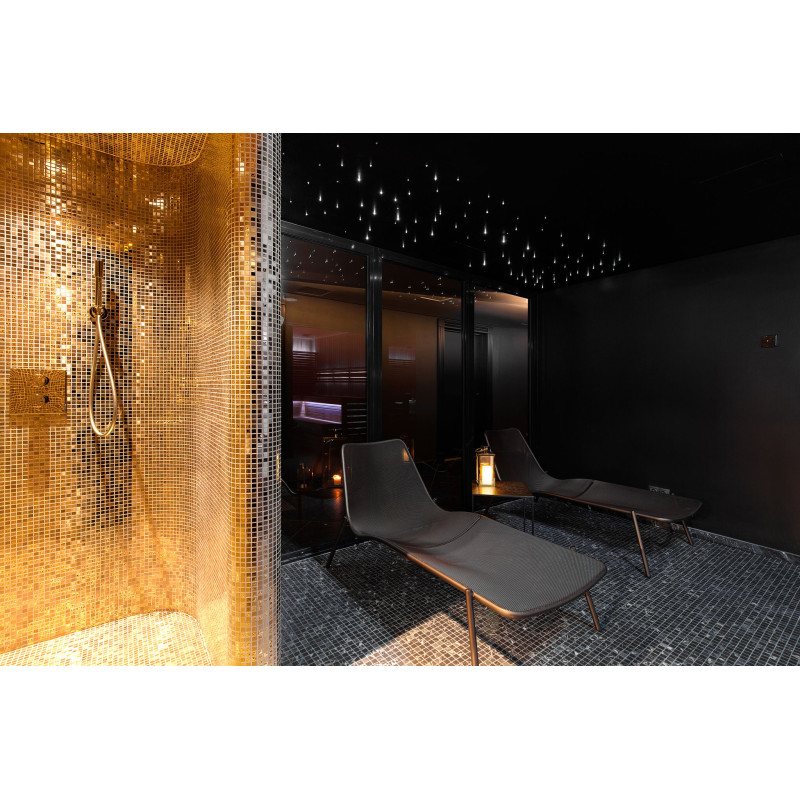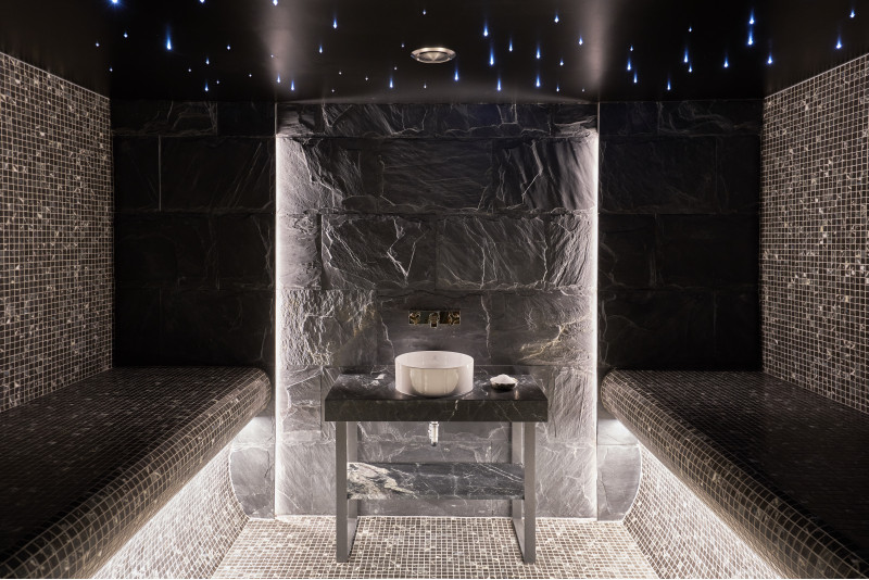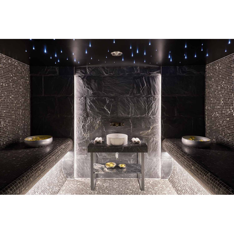 Um einen nahtlosen Stil zu schaffen, wurde auch für den Hamamraum eine Glasvitrine gewählt. Die Innenflächen werden nach individuellem Projekt aus expandiertem Polystyrol unter Verwendung von endlos geschnittenem EPS-Styrol geformt. Die Wände, Böden und Bänke des Raumes sind beheizt. Das Beleuchtungssystem verwendet LED RGB IP 67, 9m Streifen und ein Glasfasersystem "Starry Sky". Verklebte Mosaikfliesen, der Krümmung angepasst und mit grauer Schonox Abdichtung gefüllt.