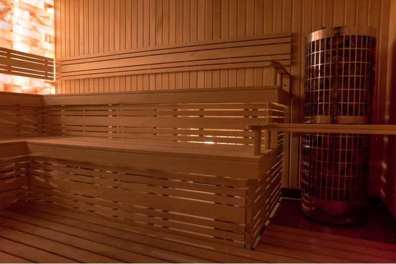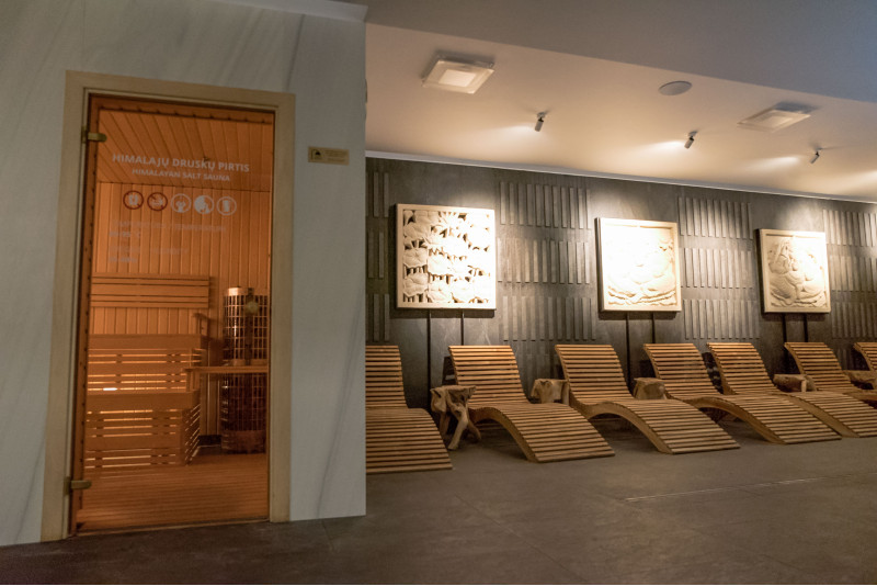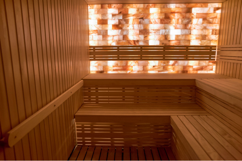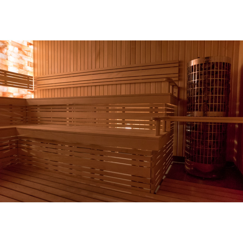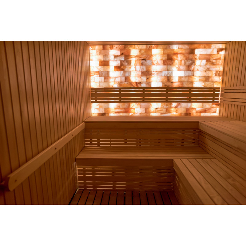 Feuchtigkeits- und temperaturbeständige 4 Lampen und LED-Beleuchtung hinter der Himalaya-Salzwand wurden zur Beleuchtung der Sauna verwendet.