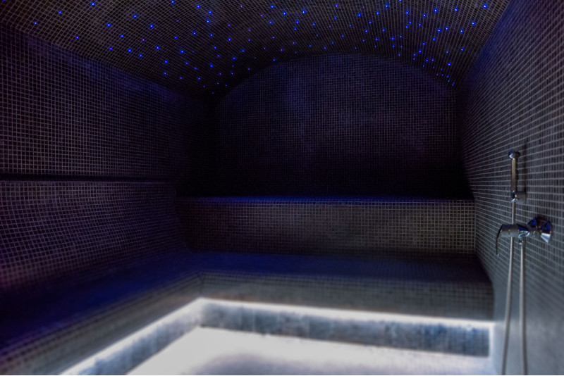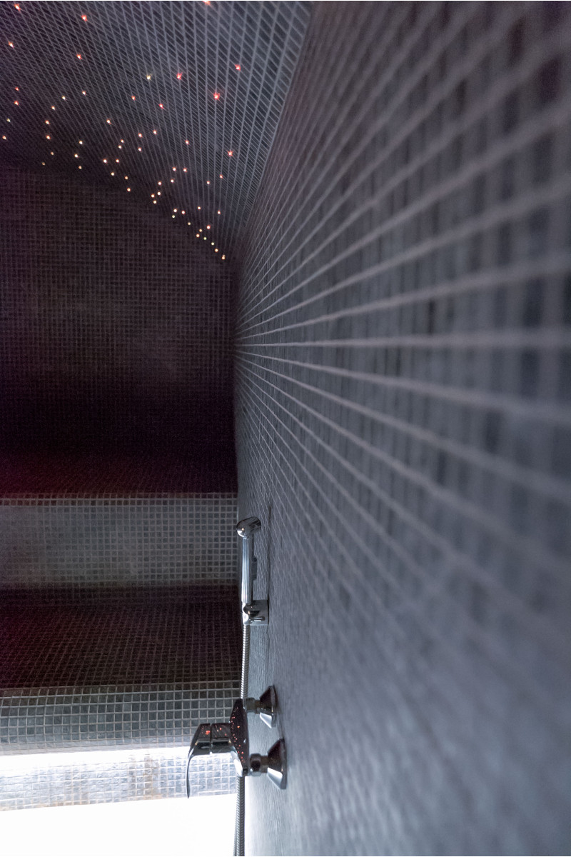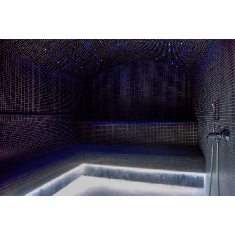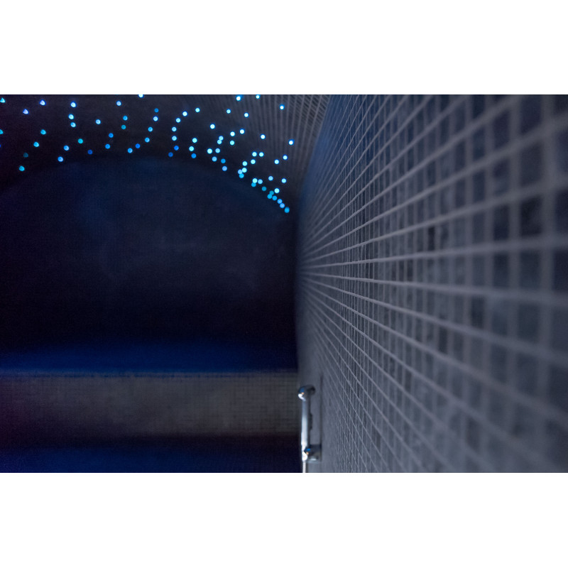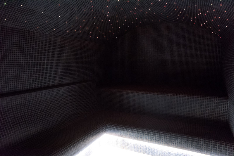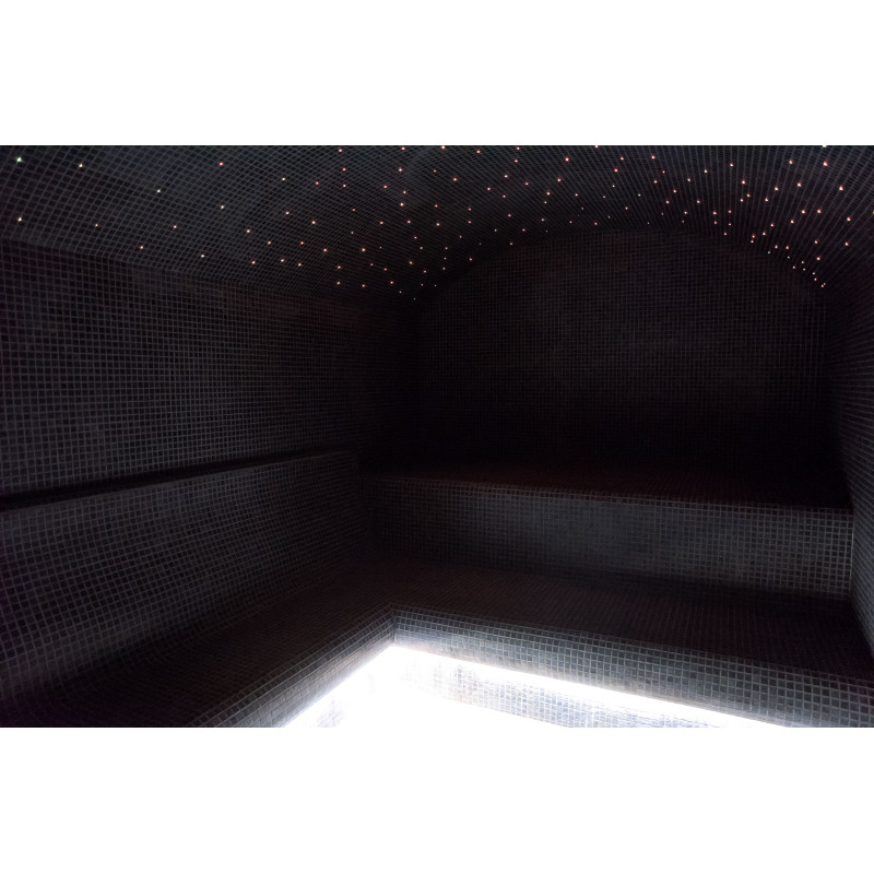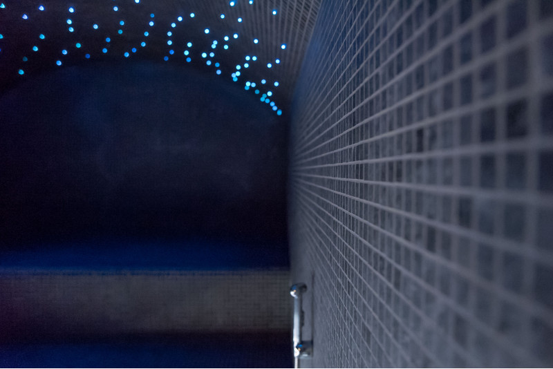 Unter den Bänken - feuchtigkeits- und temperaturbeständige LED-Beleuchtung, die den Boden beleuchtet. Zur Beleuchtung der gewölbten Decke wurde das faseroptische Beleuchtungssystem „Starry Sky“ gewählt, dessen Farben sich einfach und schnell mit dem Bedienpanel ändern lassen.
