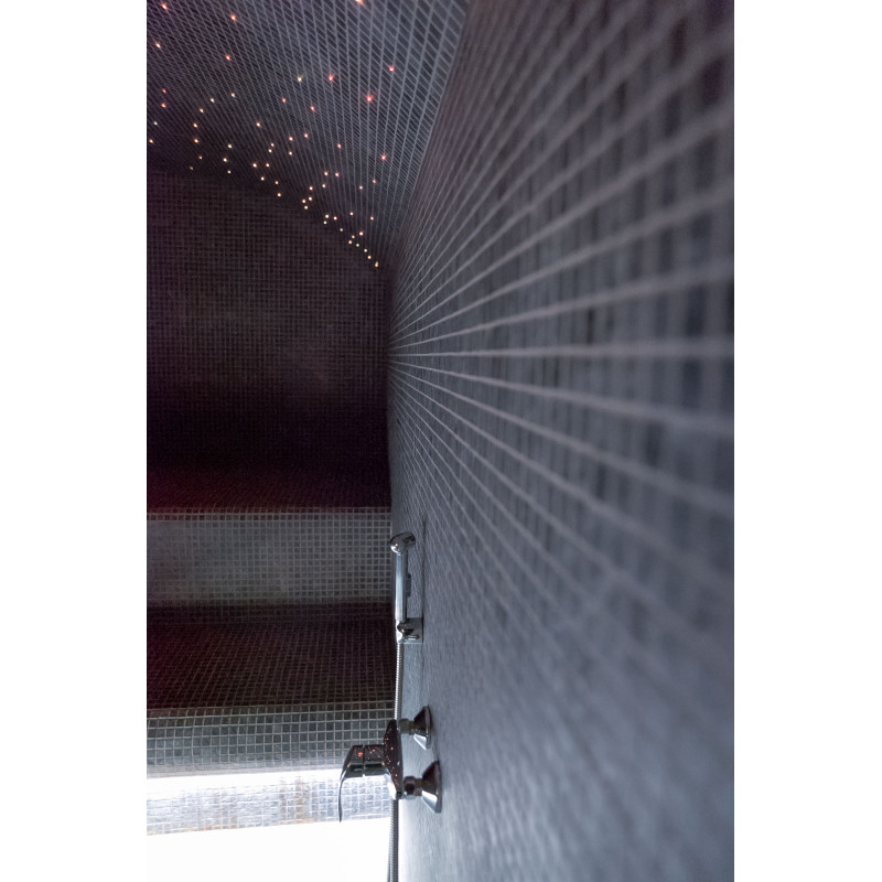 Der gesamte Saunaraum ist mit kleinen Mosaikfliesen verziert und zwei Musiklautsprecher sorgen für eine ruhige und gemütliche Atmosphäre.