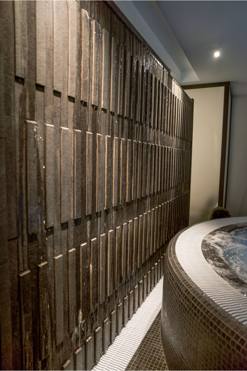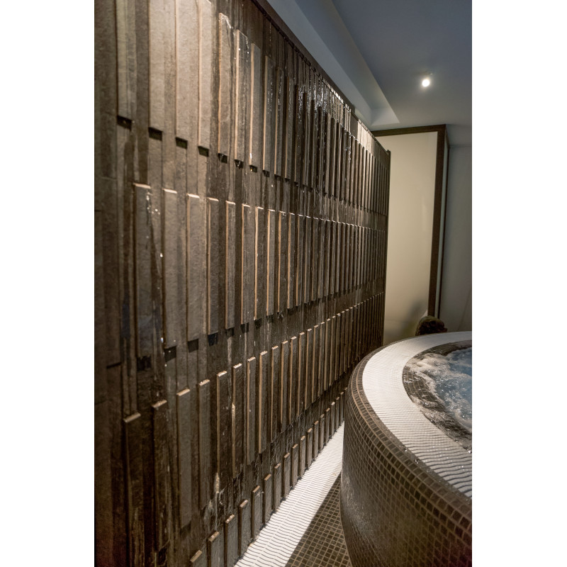 Der Pool wird von einer Wand aus fließendem Wasser eingerahmt. Wassersammel-, Leckage-, Filtersysteme sind installiert. Fallendes, tropfendes Wasser verleiht dem Spa einen tropisch-exotischen Stil. Die vom Osten geschaffene Atmosphäre ermöglicht es Ihnen, eine exklusive Erholung zu erleben.