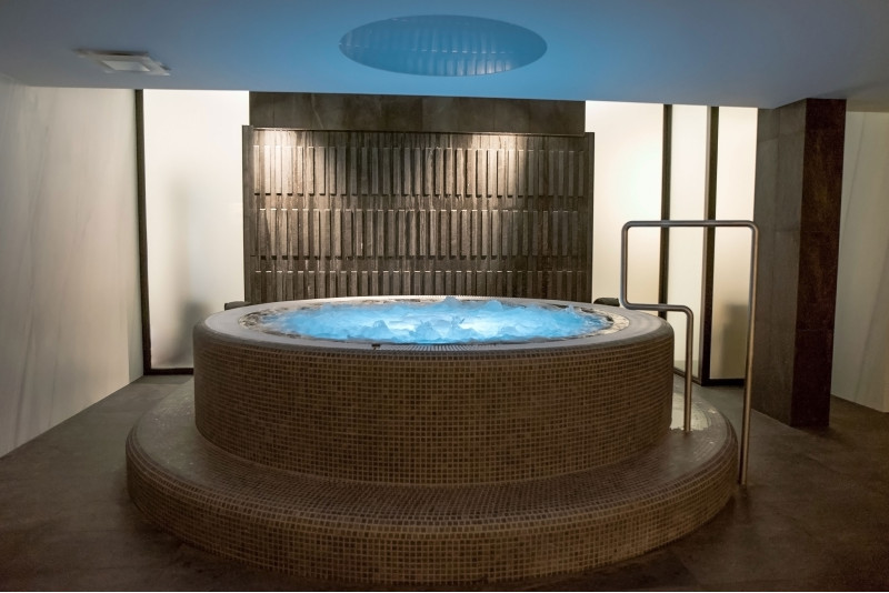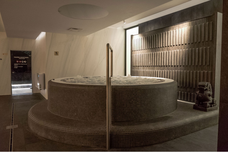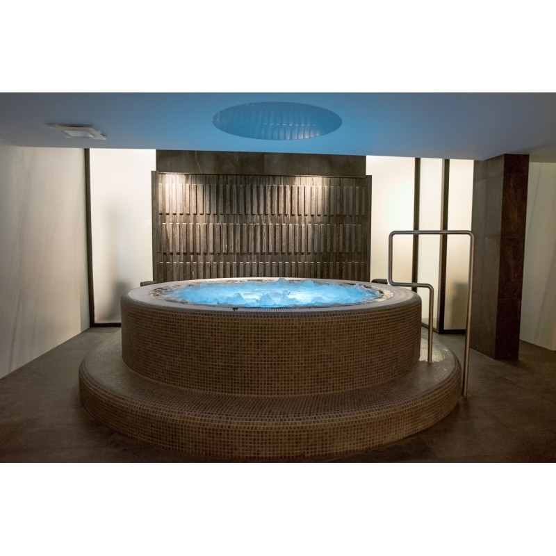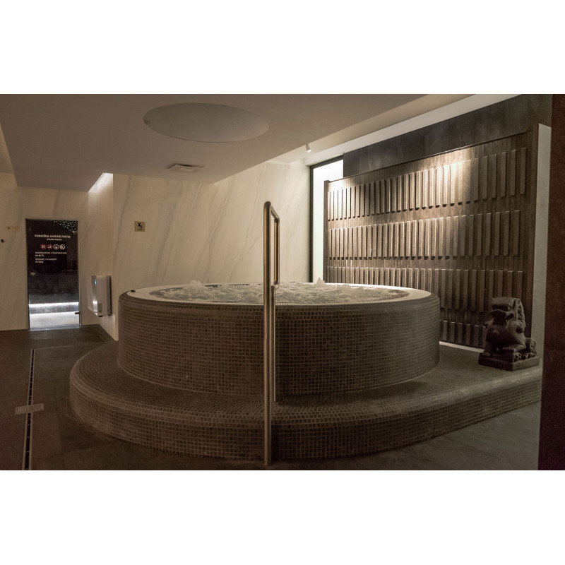 Es gibt einen geräumigen Hydromassage-Pool, dessen Formen auf individuelle Bestellung aus Polystyrolschaum hergestellt werden. Der Pool ist mit kleinen Mosaikfliesen bedeckt, die zum neutralen Interieur passen. Es gibt eine Stufe um den Pool herum, einen Edelstahlhandlauf für einen einfachen und sicheren Zugang zum Pool.